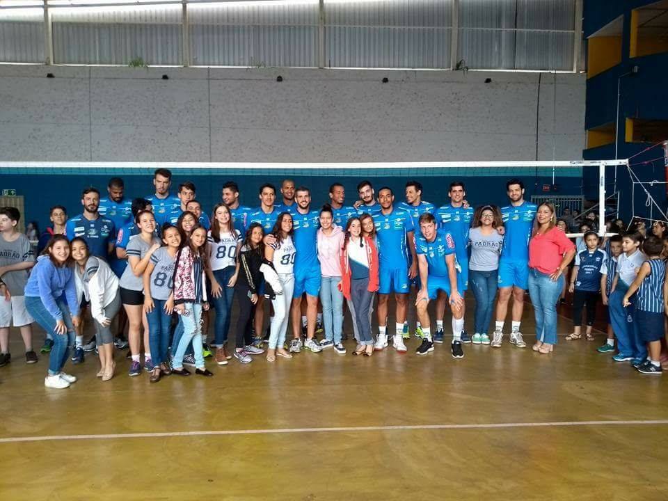 Atletas e comissão técnica foram recebidos com muita empolgação pelos alunos que puderam conversar, fotografar e participar de uma divertida partida de vôlei com time misto entre profissionais e estudantes.